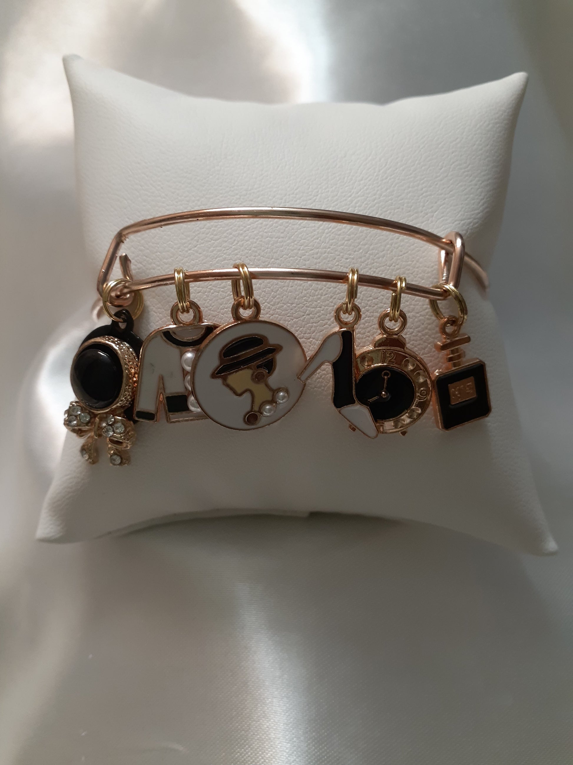 Gorgeous gold tone bangle bracelet with black, white and gold tone charms. Some bracelets will have a glass ball or a tassel and just the charms. The charms are randomly picked.