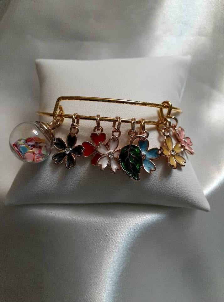 This colorful bangle comes with 5 different color charms and a glass ball. The bangle is expandable and it has gold color tone.
