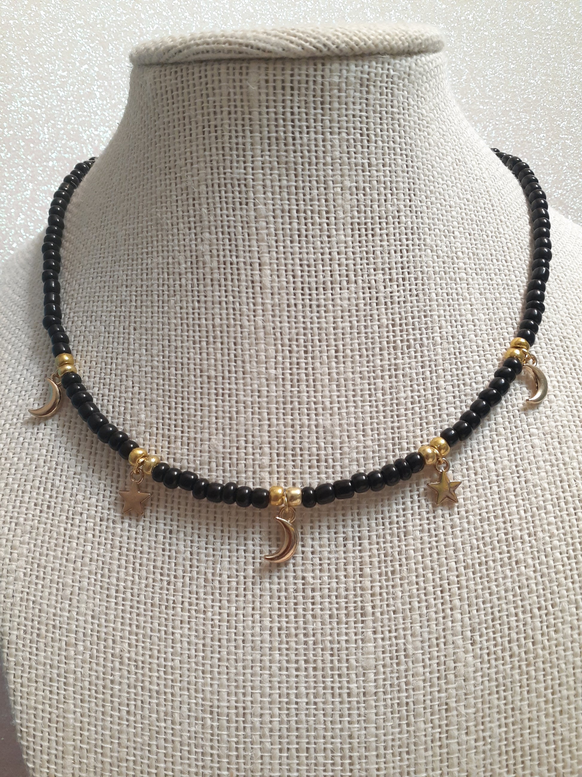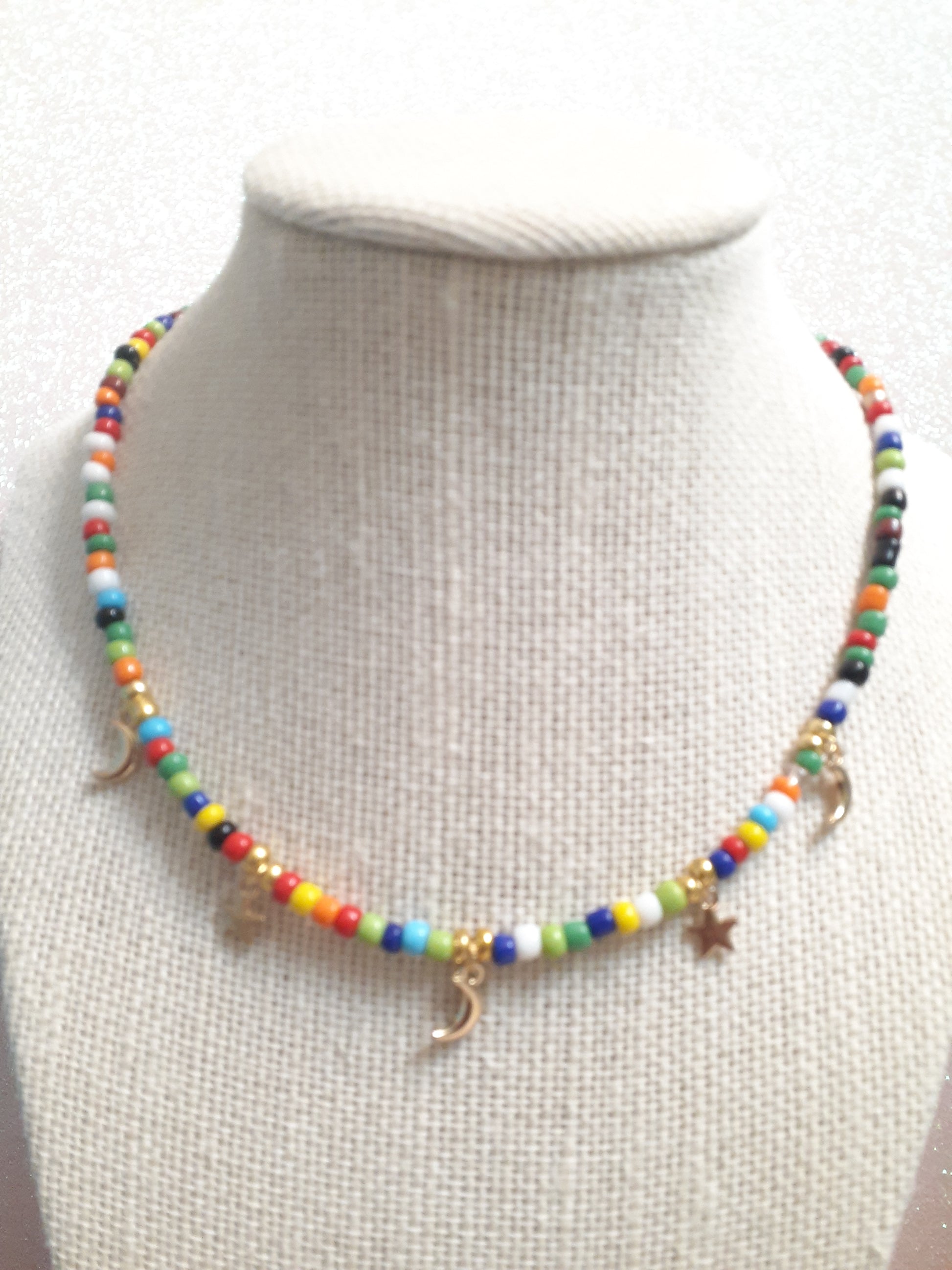This dainty necklace is made of seedbeads, has 3 gold tone tiny moons and 3 tiny gold tone stars. If you prefer your moon and stars silver, just leave me a message. The length of the necklace is about 16, it also comes with a 1 1/2 extender chain. The closure is a lobster clasp. The necklace comes in a variety of colors, red, sky blue, white, black, coral, and rainbow. All my jewelry is custom handmade by me.